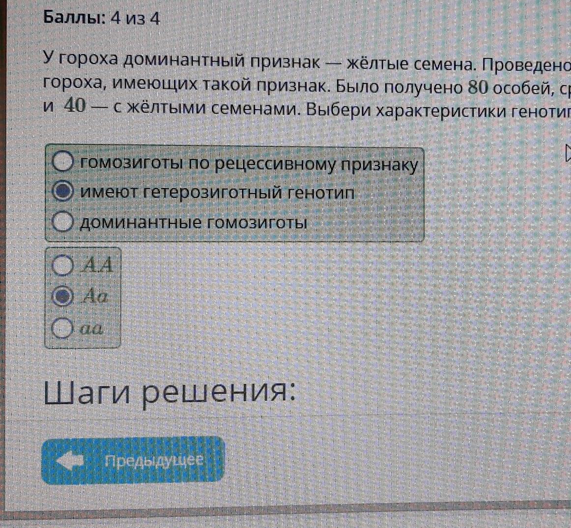 У гороха доминантный признак — жёлтые семена. Проведено анализирующее скрещивание растений гороха, имеющих такой признак. Было получено 80 особей, среди которых 40 — с зелёными семенами и 40 — с жёлтыми семенами. Выбери характеристики генотипа анализируемых растений: