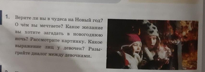 Смотри)Это очень легкоВопрос-Верите ли вы в чудеса?Отвечаешь-Например-Да!Дальше вопрос.Какое желание вы хотите загадать в новогоднюю ночь?Отвечаешь.-Я бы хотела загадать чтоб все были счастливы и здоровы!(например)Какое выражение у лиц девушек?-У девочек выражение лиц -удивлённое.(это правильно)Разыграйте диалог с девочкой там или подружкой.Просто напиши разговор о новом году!)И всё.Знаю я не так тебе помогла!)Но всё таки)))))Я в 5 классе если со))))))