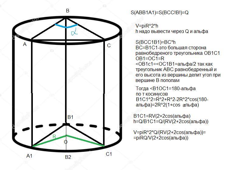 Через образующую цилиндра проведены две плоскости пересекающие цилиндр. Угол между плоскостями равен альфа, а площади получившихся сечений равны Q . Радиус основания цилиндра = R . Найдите объем цилиндра.