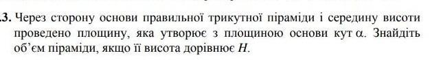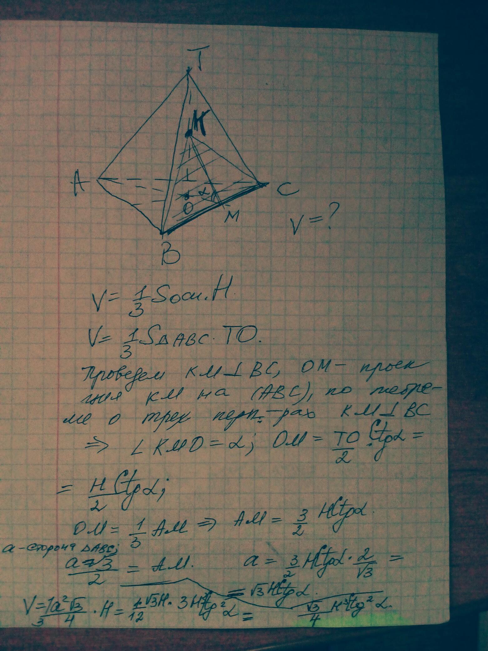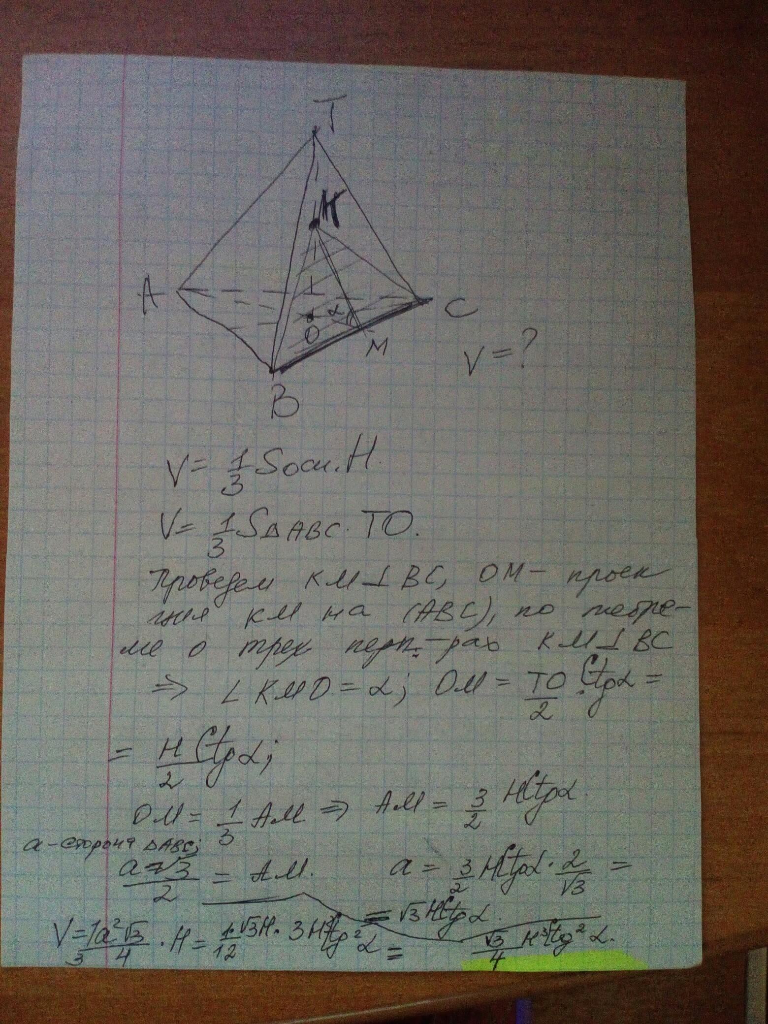 V = (1/3)SoH = (1/3)(3H²√3/(4tg² α))*H = H³√3/(4tg² α).