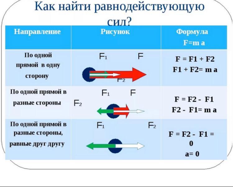 Например, если тело толкают в одну сторону две силы в 20 Н и 30 Н, то равнодействующая сила этим двум будет равна 50 Н