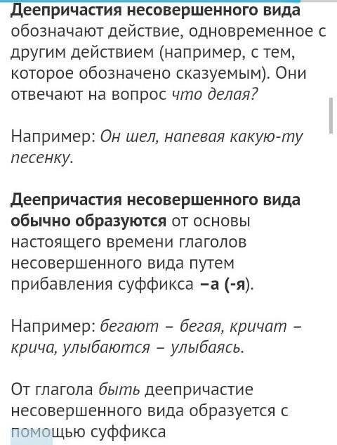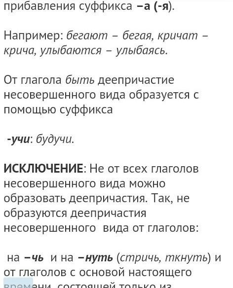 Деепричастия несовершенного вида обр. от основы глагола наст. вр. путём прибавления суффиксов: а я. пример: требуют-требуя