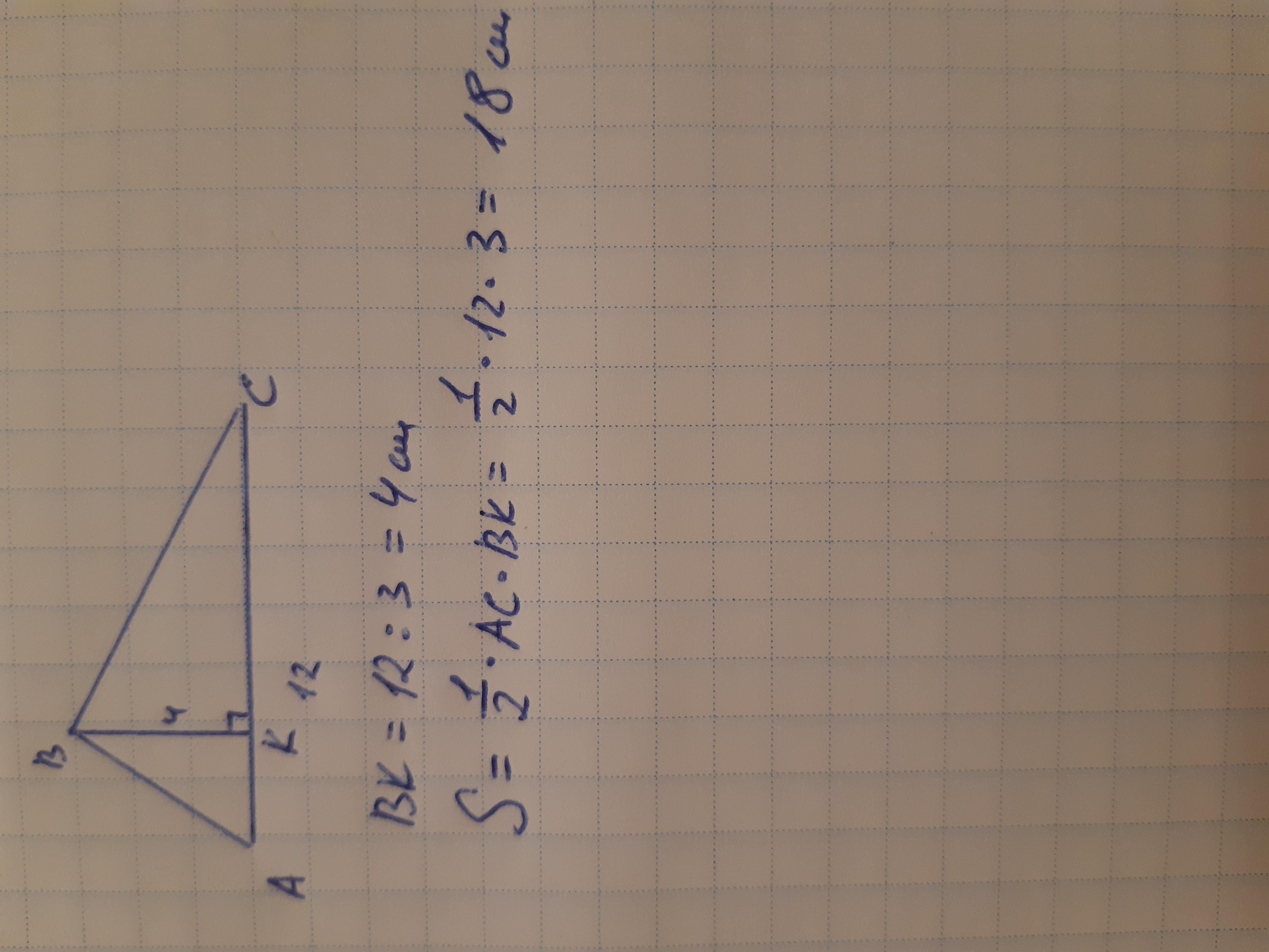 Сторона треугольника равна 12см а высота проведенная к ней в три раза меньше высоты найдите площадь треугольника