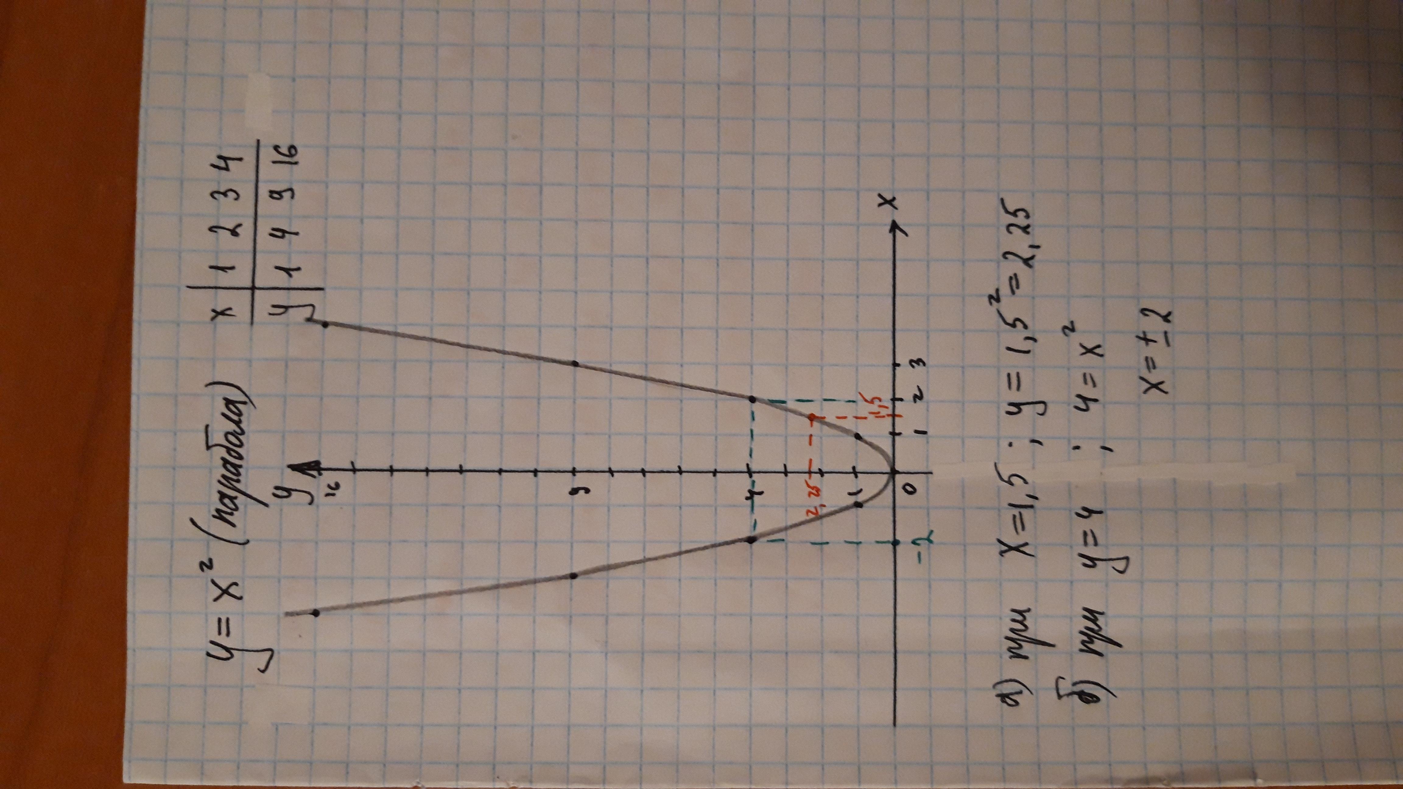 Построить график функций y=x^2. c помощью графика найти : а)значение функции , соответствующее значение значению аргумента , равному 1,5