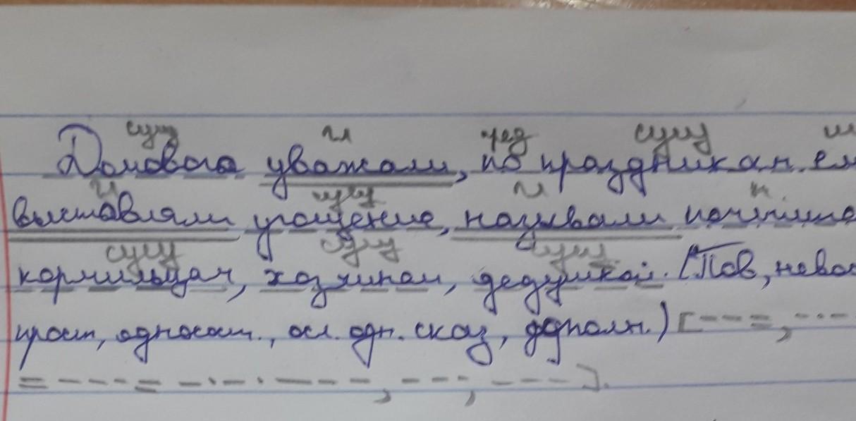 Помогите пожалуйста сделать полный синтактический разбор (как подчеркивать, часть, и что в скобках писать) предложения:Домового уважали, по праздникам ему выставляли угощение, называли почтительно кормильцам, хозяином, дедушкой
