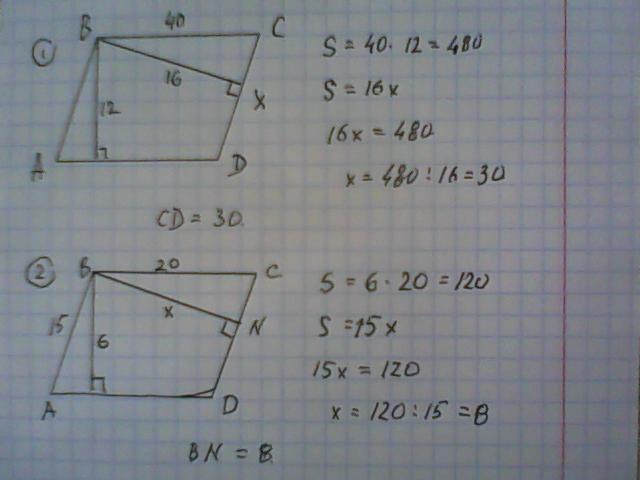 1) Высоты параллелограмма равны 16 и 12, большая сторона - 40. Найти вторую сторону.