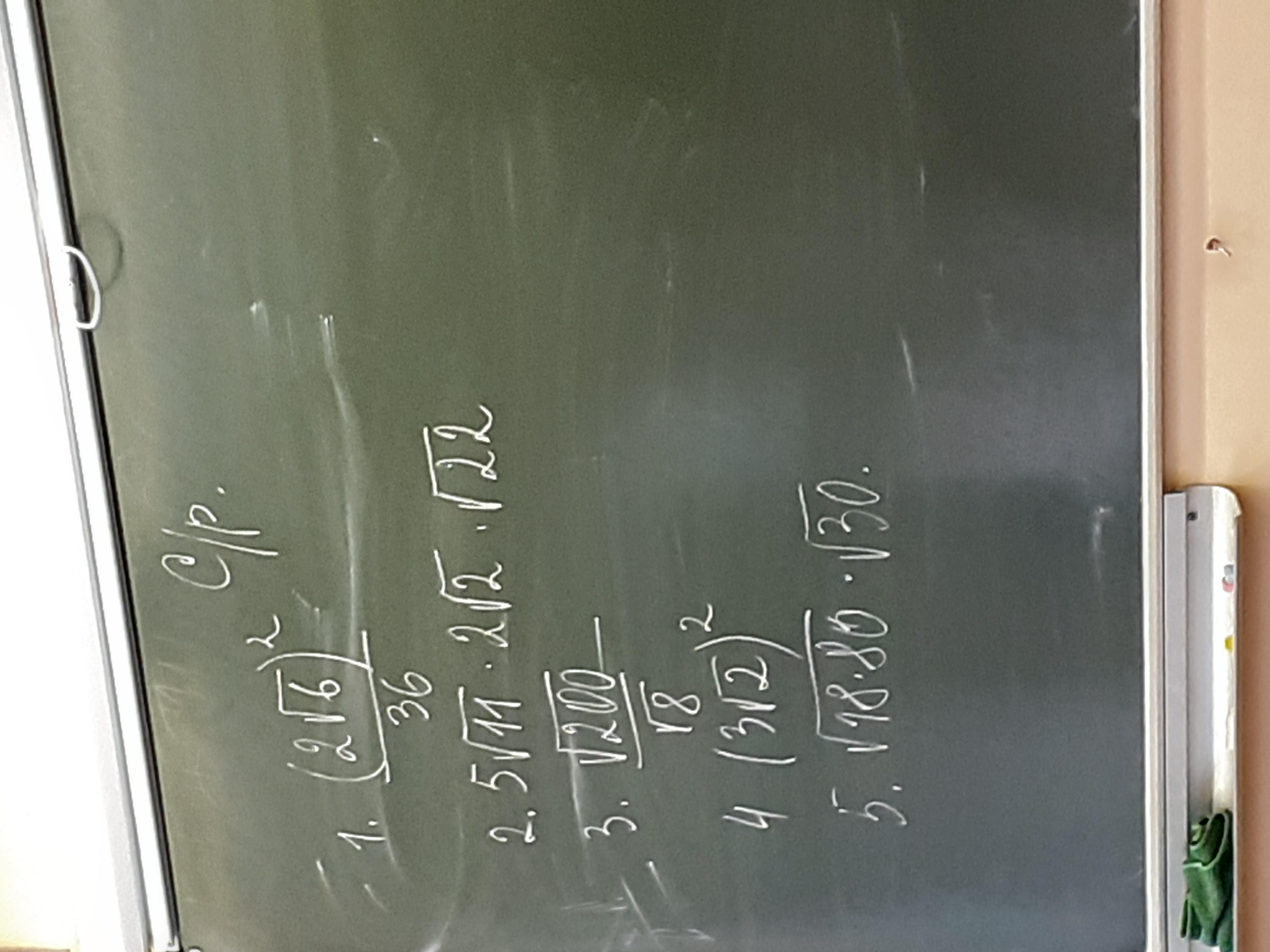1)\; \; \frac{(2\sqrt6)^2}{36}=\frac{4\cdot 6}{36}=\frac{2}{3}\\\\2)\; \; 5\sqrt{11}\cdot 2\sqrt2\cdot\sqrt{22}=10\sqrt{11\cdot 2\cdot 22}=10\sqrt{22\cdot 22}=10\cdot 22=220\\\\3)\; \; \frac{\sqrt{200}}{\sqrt8}=\sqrt{\frac{200}{8}}=\sqrt{25}=5\\\\4)\; \; (3\sqrt2)^2=9\cdot 2=18\\\\5)\; \; \sqrt{18\cdot 80}\cdot \sqrt{30}=\sqrt{9\cdot 2\cdot 16\cdot 5\cdot 3\cdot 2\cdot 5}=\sqrt{3^2\cdot 2^2\cdot 4^2\cdot 5^2\cdot 3}=\\\\=3\cdot 2\cdot 4\cdot 5\sqrt3=120\sqrt3