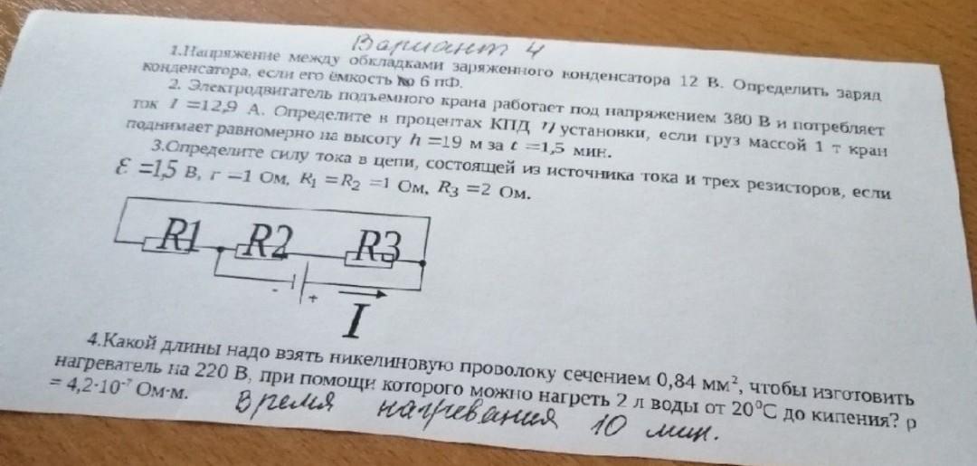 4. Потребная мощность нагревателя Р=Q/t= mc∆T/t=2*4200* (100-20)/ (10*60)= 1120 Bт