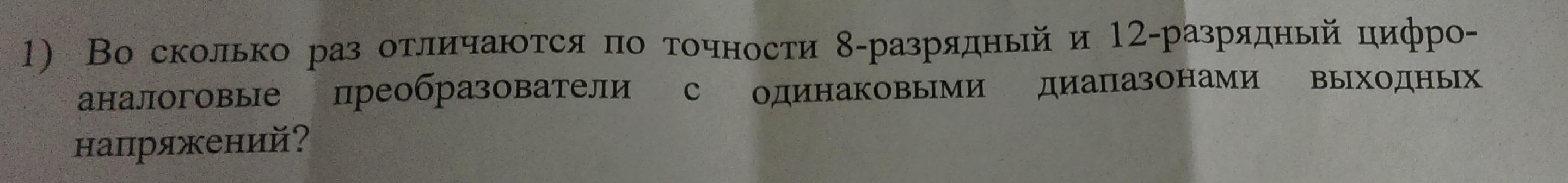 Во сколько раз отличаются по точности 8-разрядный и 12-разрядный цифроаналоговые преобразователи с одинаковыми диапозонами выходных напряжений?