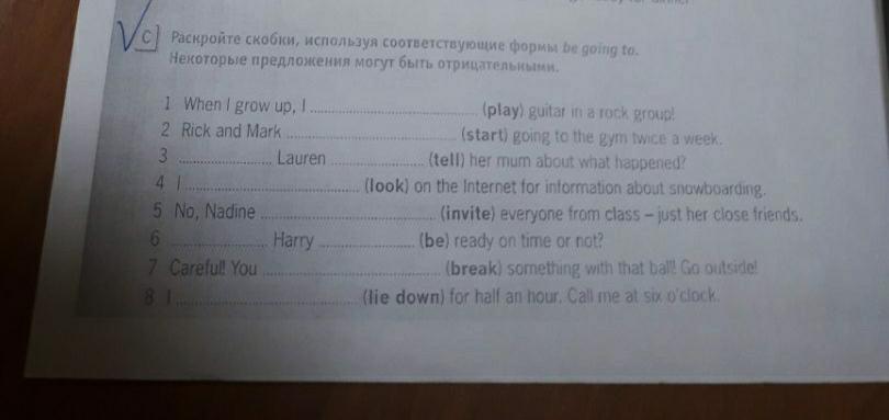 1 am going to play 2 are going to start 3 is Lauren going to tell 4 am going to look 5 is going to invite 6 is Harry going to be 7 are going to break 8 are going to lie down