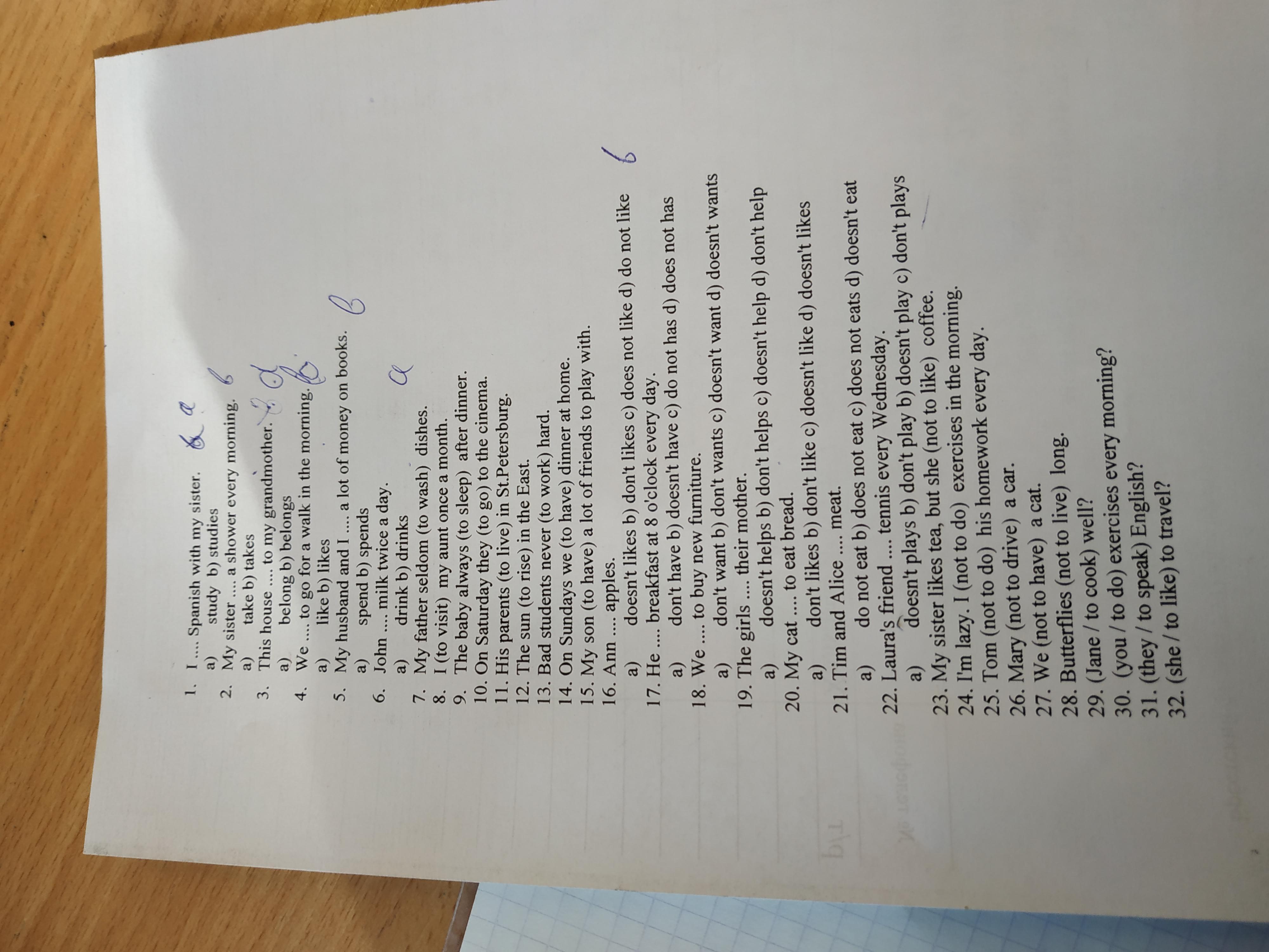 22. Laura's friend tennis every Wednesday. b) doesn't play
