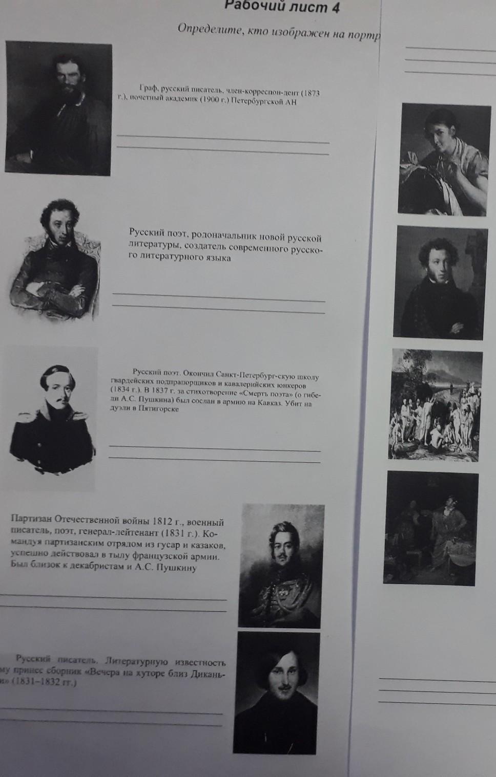 ОтветСверху вниз: Лев Николаевич Толстой, Александр Сергеевич Пушкин, Михаил Юрьевич Лермонтов, Денис васильевич Давыдов, Николай Васильевич Гоголь