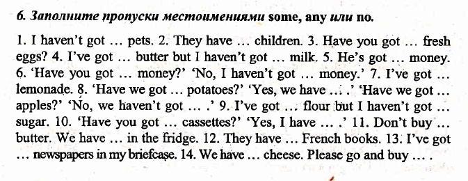 1. I haven't got any pets. 2. They have no children. 3. Have you got any fresh eggs? 4. I've got some butter but I haven't got any milk. 5. He's got no money. 6. 'Have you got any money?' 'No, I haven't got any money.' 7. I've got no lemonade. 8. 'Have we got any potatoes?' 'Yes, we have some.' 9. I've got some flour but I haven't got any sugar. 10. 'Have you got any cassettes?' 'Yes, I have some.' 11. Don't buy any butter. We have some in the fridge. 12. They have no French books. 13. I've got no newspapers in my briefcase. 14. We have no cheese. Please go and buy some.