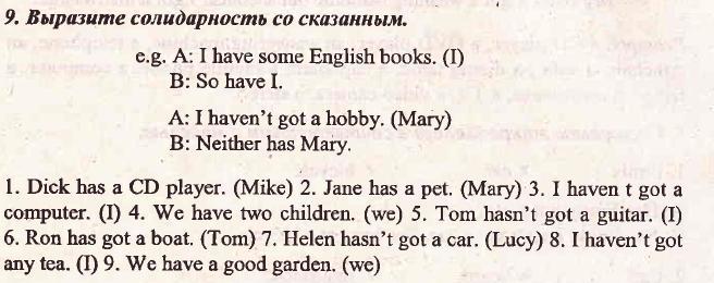 1. Dick has a CD player. So has Mike. 2. Jane has a pet. So has Mary. 3. I haven't got a computer. Neither have I. 4. We have two children. So have we. 5. Tom hasn't got a guitar. Neither have I. 6. Ron has got a boat. So has Tom. 7. Helen hasn't got a car. Neither has Lucy. 8. I haven't got any tea. Neither have I. 9. We have a good garden. So have we.
