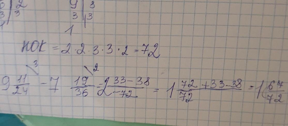 9 11/24-7 19/36. У меня получилось (9-7) +11*3 а общий знаменатель 72 но не понимаю почему где 19 там потом должно быть 38