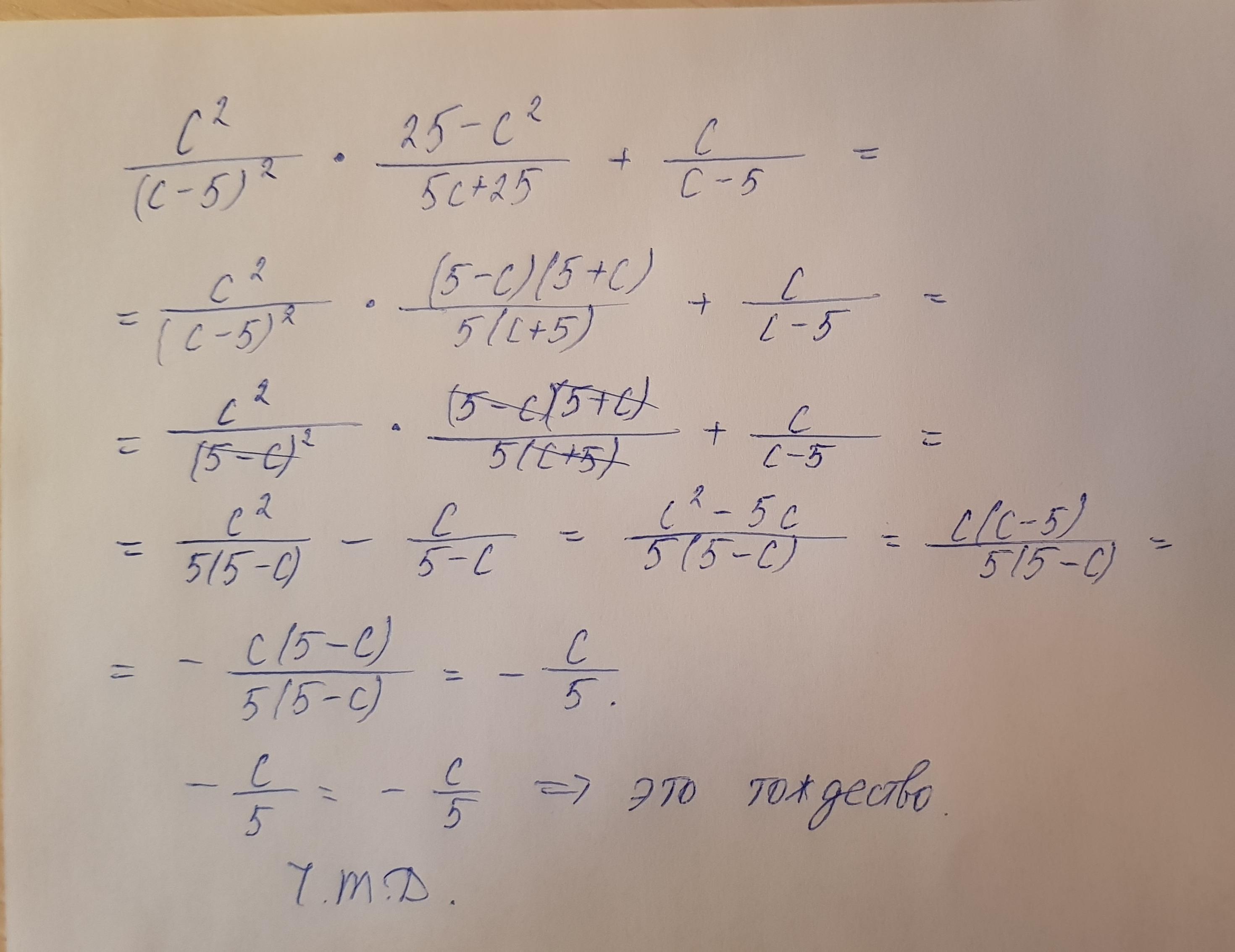 Чтобы доказать, что это тождество, преобразуем левую часть выражения. Сначала раскладываем на множители, далее меняем знак выражения в квадрате(мы можем это сделать, т. к. квадрат всегда неотрицательный). Далее сокращаем; выносим минус из знаменателя; приводим к общему знаменателю; выносим минус; сокращаем. Полученное выражение равно данному, значит, это тождество, что и требовалось доказать.
