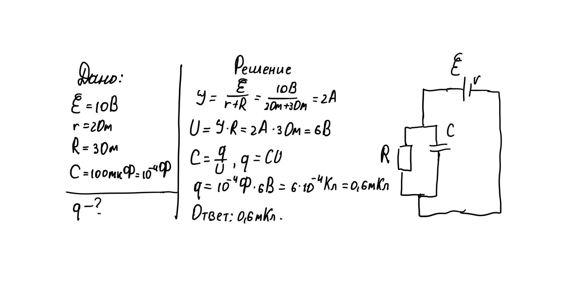 и внутренним сопротивлением r = 2 Ом и параллельно подключенных сопротивления R = 3 Ом и конденсатора емкостью С = 100 мкФ. Определить