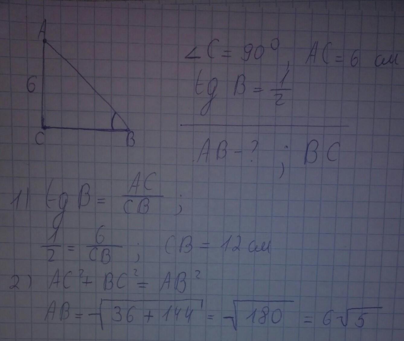 В треугольнике АВС угол С равен 90 градусов, АС=6, тангенс угла В равен 1/2. Найдите АВ и ВС. Пожалуйста полный ответ с рисунком. Спасибо