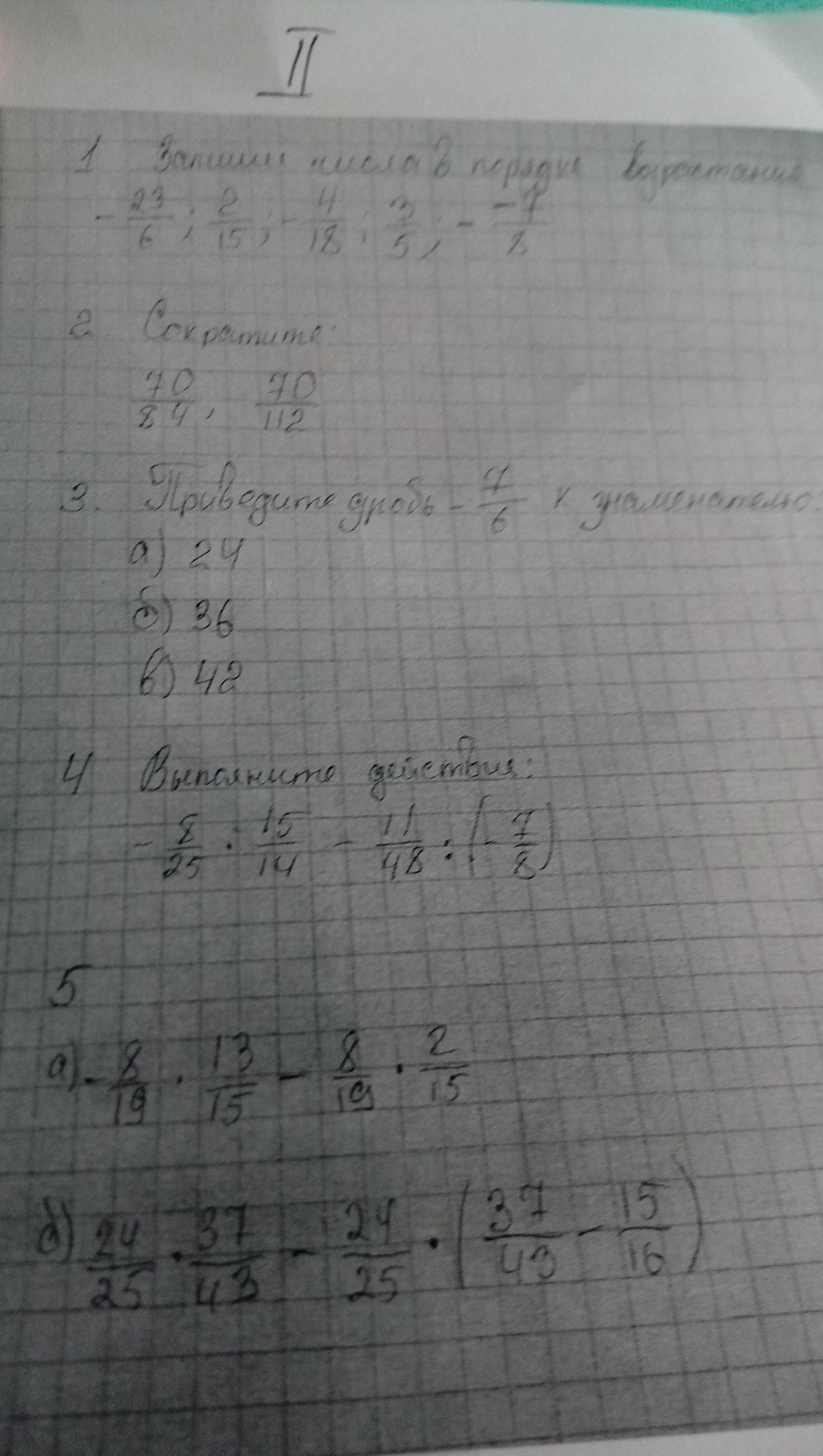 1. -4/8 ; - 23/6 ; 2/15 ; 3/5 ; - -7/8