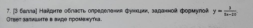 Найдите область определения функции, заданной формулы y=3/5x-20. Ответ запишите в виде промежутка.