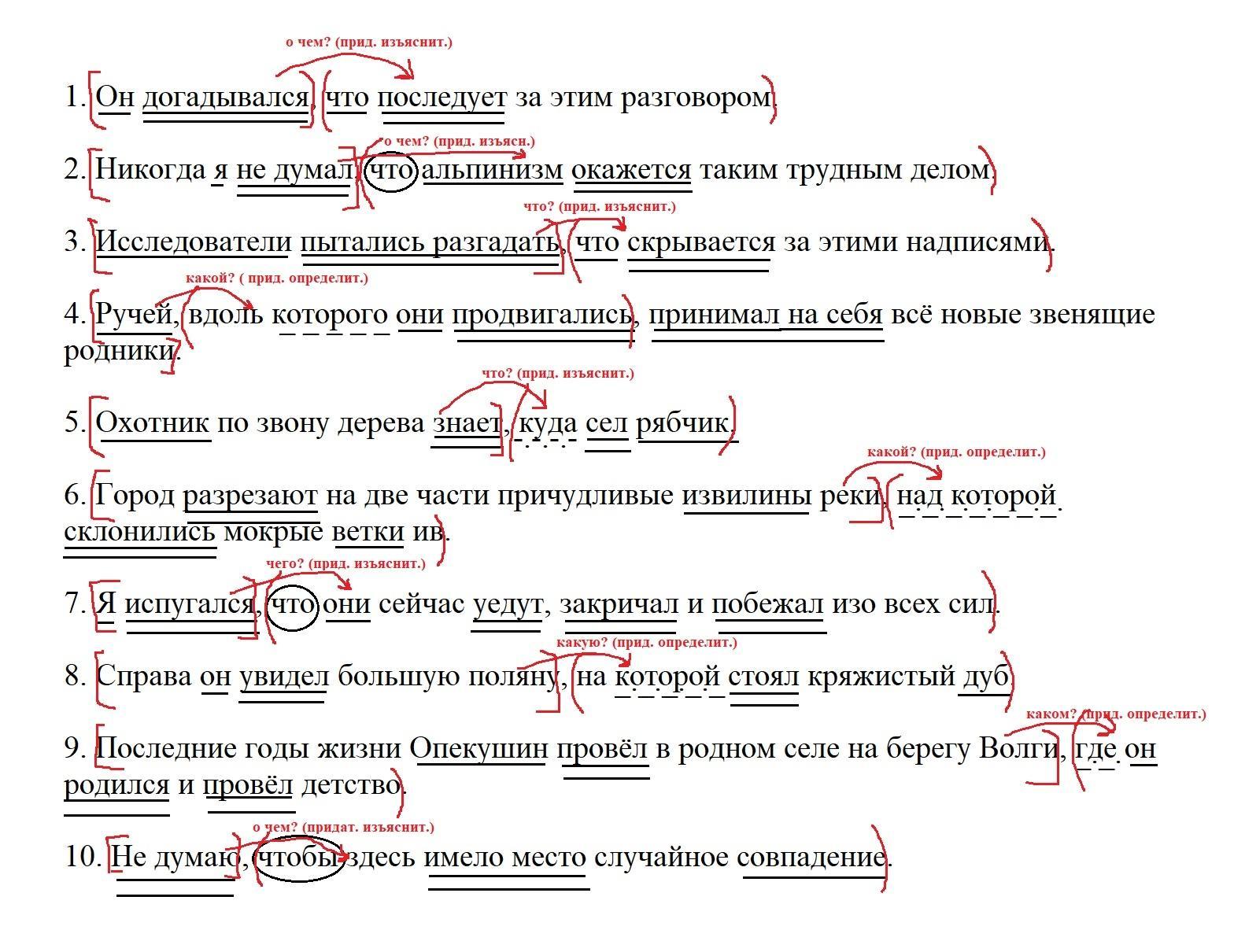 Расставьте в предложениях пропущенные знаки препинания. Главное предложение заключите в квадратные скобки, придаточное – в круглые. Подчеркните грамматические основы простых предложений, входящих в состав сложноподчинённого. Подчинительные союзы заключите в овал, союзные слова подчеркните как члены предложения. Сверху над придаточными предложениями укажите их вид. 1. Он догадывался что последует за этим разговором. 2. Никогда я не думал что альпинизм окажется таким трудным делом. 3. Исследователи пытались разгадать что скрывается за этими надписями. 4. Ручей вдоль которого они продвигались принимал на себя всё новые звенящие родники. 5. Охотник по звону дерева знает куда сел рябчик. 6. Город разрезают на две части причудливые извилины реки над которой склонились мокрые ветки ив. 7. Я испугался что они сейчас уедут закричал и побежал изо всех сил. 8. Справа он увидел большую поляну на которой стоял кряжистый дуб. 9. Последние годы жизни Опекушин провёл в родном селе на берегу Волги где он родился и провёл детство. 10. Не думаю чтобы здесь имело место случайное совпадение ДАМ 20 БАЛЛОВ ЖЕЛАТЕЛЬНО ПО ФОТО!!!! СРОЧНО!!!!
