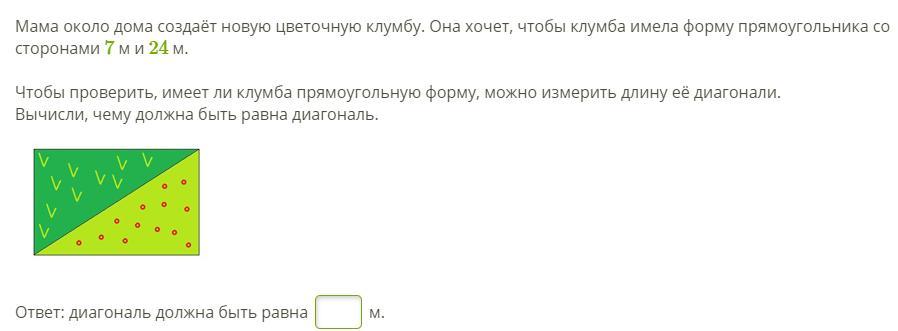 Мама около дома создаёт новую цветочную клумбу. Она хочет, чтобы клумба имела форму прямоугольника со сторонами 7 м и 24 м.