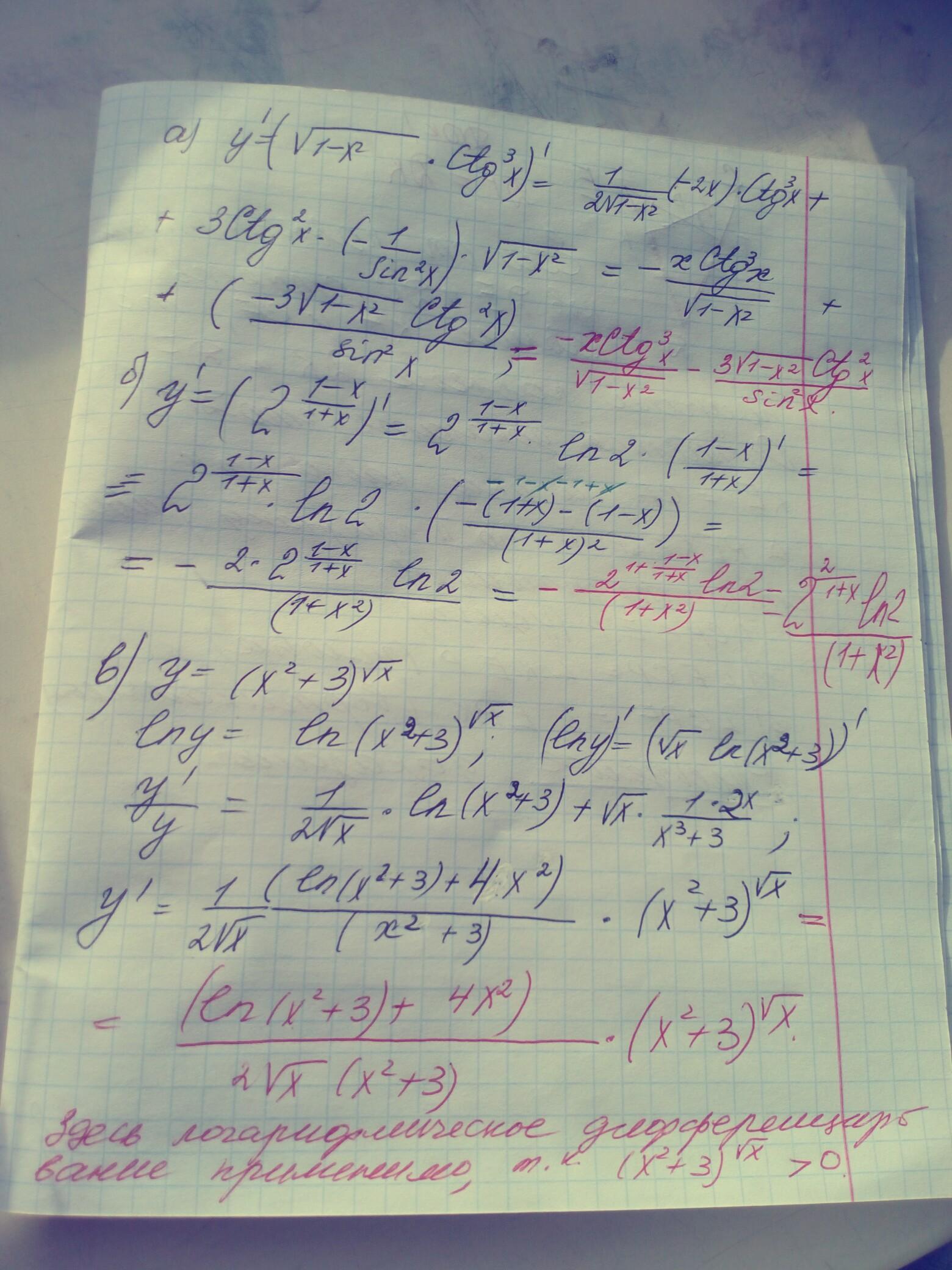 лень расписывать.. а) через производную произведения, в б) и в) представляешь выражения как е в степени натурального логарифма этого выражения