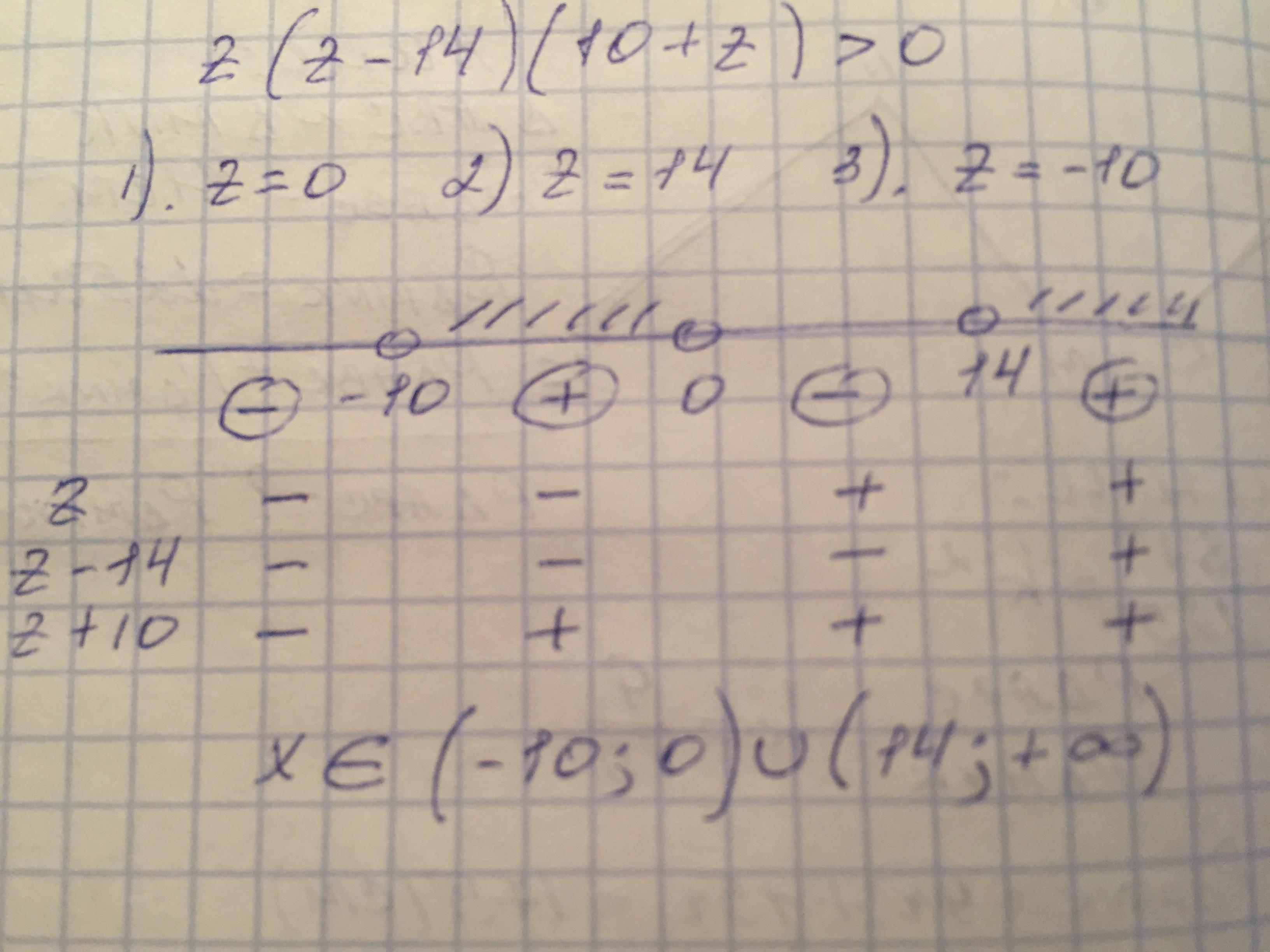 Реши неравенство z(z−14)(10+z)>0. Выбери правильный вариант ответа: −10≤z≤0;z≥14 −1014 z≤−10;0≤z≤14 z<−10;0
