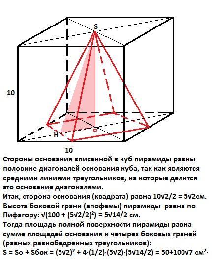(80 баллов)Дан куб ребро которого равно 10 см. Центр верхнего основания куба и середины сторон его нижнего основания служат вершинами вписанной в этот куб пирамиды. Найти площадь полной поверхности вписанной пирамиды. (можно подробное решение, пожалуйста)