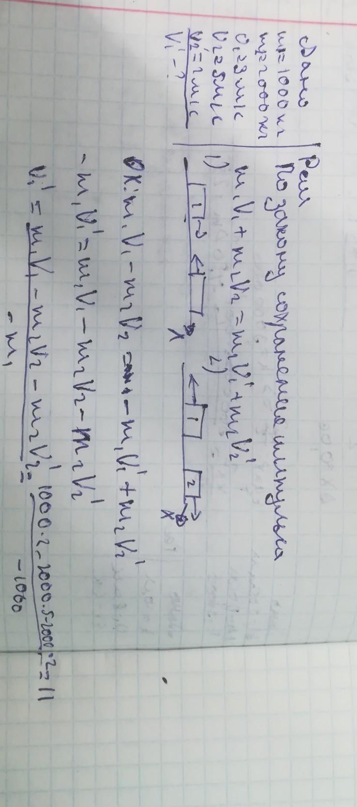 Вагоны массой 1т и 2т движутся навстречу друг другу со скоростями 3 м/с и 5 м/с соответственно. После столкновения вагоны разъезжаются в противоположные стороны,при этом второй приобретает скорость 2 м/с. Найти скорость первого вагона после взаимодействия.