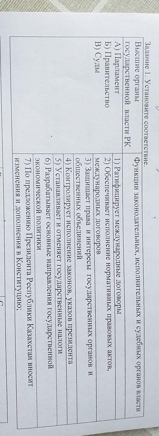 Ответ:Парламент Разрабатывает основные направления государственной политики (6) Правительство обеспечивает исполнение нормативный актов международных договоров (2)