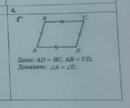 Соедините вершины В и D четырехугольника. Получите два треугольника, все три стороны которых равны. Эти треугольники равны по третьему признаку равенства треугольников.