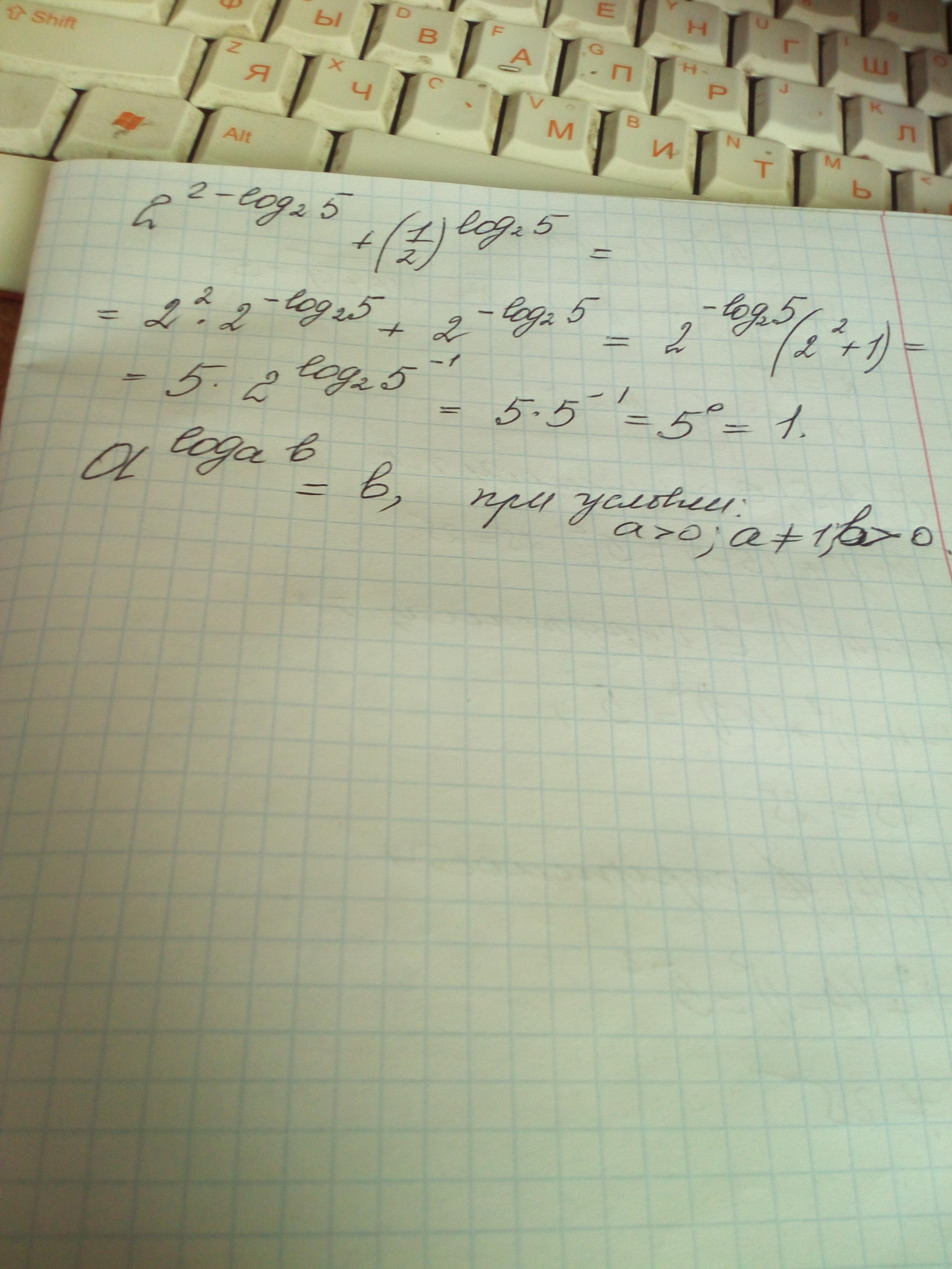 2^(2-log₂5)+(1/2)^log₂5=2²/(2^log₂5)+2^(-log₂5)=(4/5)+2^(log₂5⁻¹)=