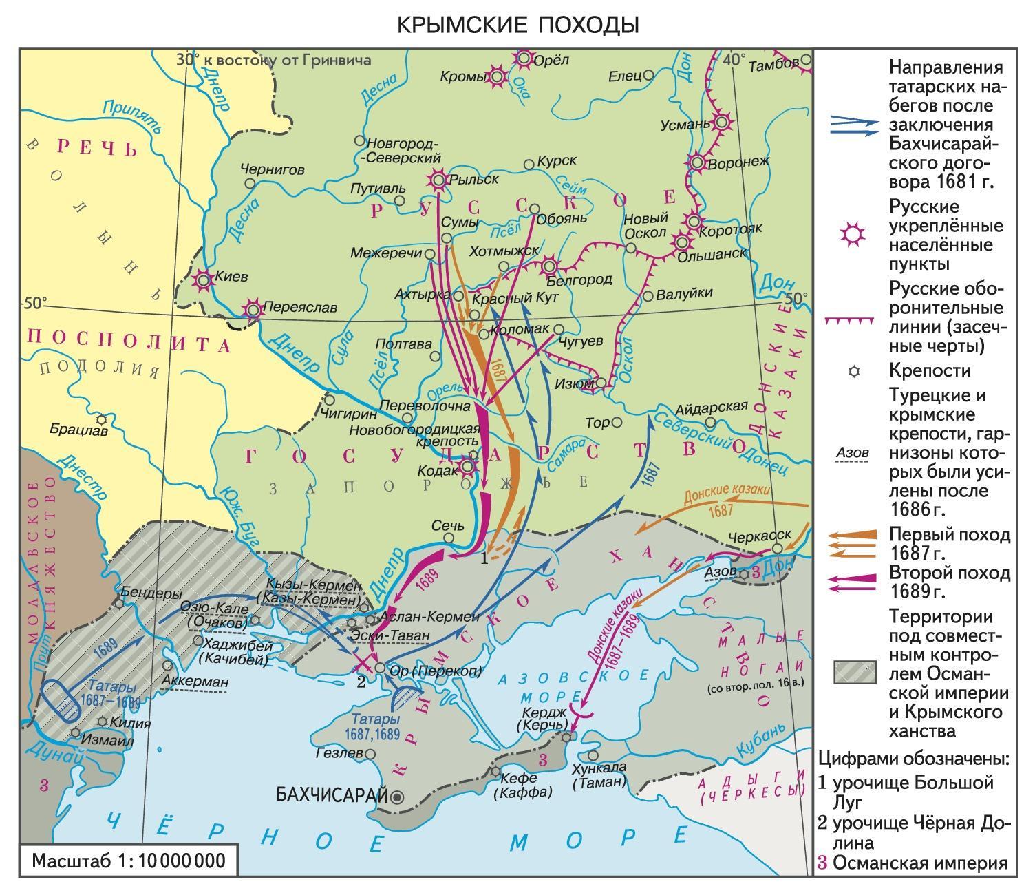 Русская армия направлялась в 1687-1689 гг. к Крыму. Это происходило потому, что Крым был расположен на небольшом полуострове, который вскоре стал разбойным. Страна зачастую нападала на Россию. У них даже получилось сжечь Москву - столицу России в 1700 году. Но, увы, русское войско не смогло вернуться на Родину с победой, несмотря на то, что крымские нападения и осады прекратились. Однако в последующих годах Крым был захвачен и перейдён на сторону России.