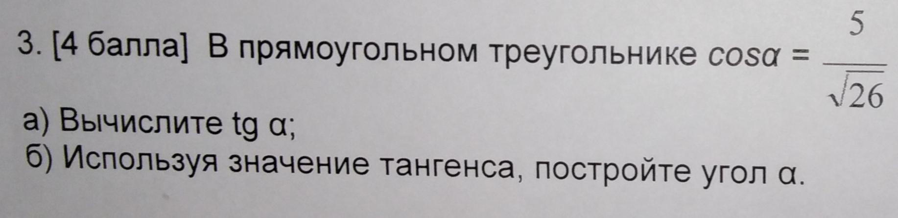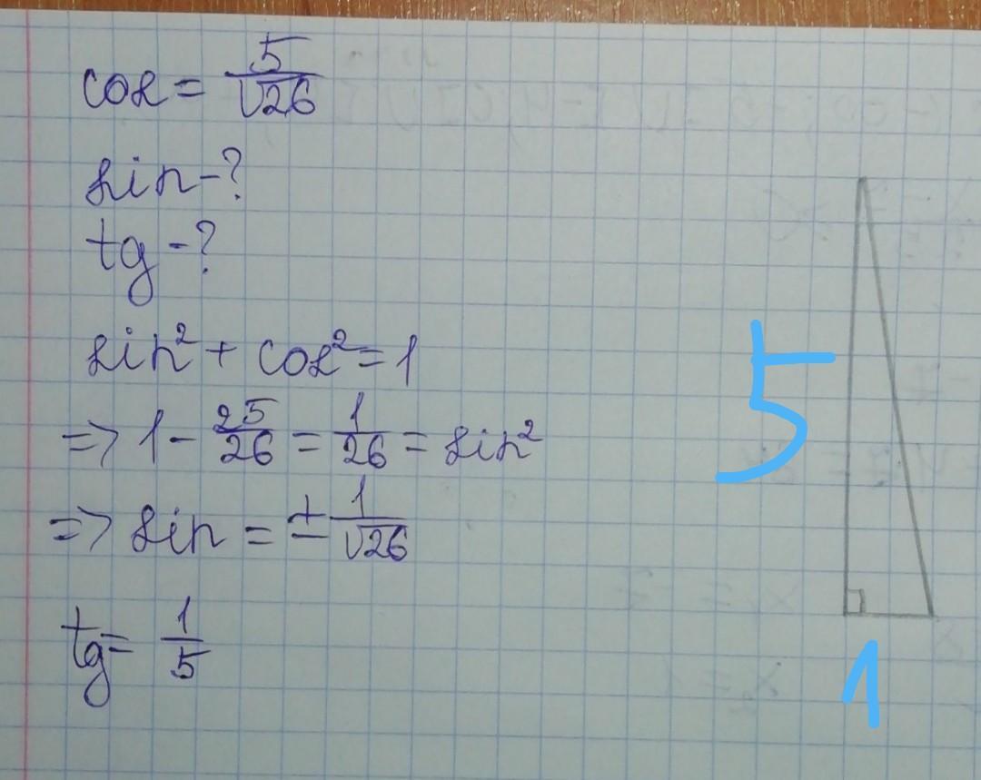 1+tg^2a=1/cos^2a; tg^2 a=1/(25/26)-1=26/25-1=1/25; tga=1/5
