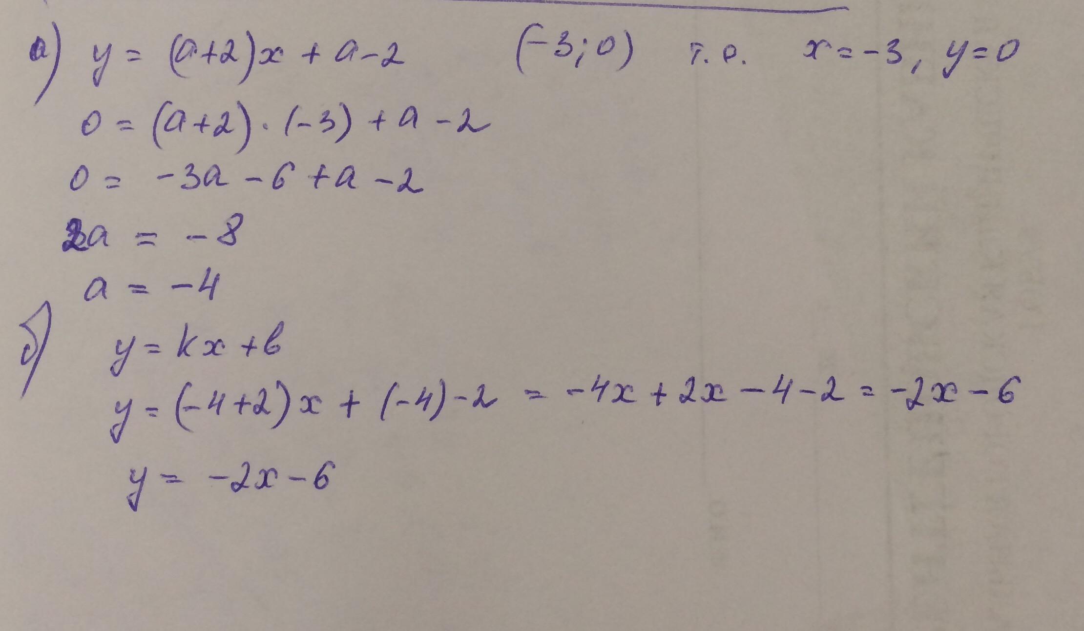 Завтро контрольная!!!!Решите пожалуйста!!!График функции заданной уравнением у=(а+2)х+а-2 пересекает ось абцисс в точке с координатами (-3;0)