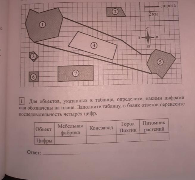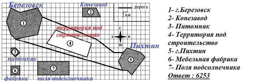 На плане изображены два города с прилегающей к ним территорией (сторона каждой клетки на плане равна 2 км). Город Пихтин расположен юго‐ восточнее города Берёзовска и соединён с ним двумя автомобильными дорогами, между которыми находится территория под строительство нового агрокомплекса. К востоку от Берёзовска находится конезавод, а южнее – питомник декоративных растений площадью 10 км2. Также рядом с городами находится территория мебельной фабрики квадратной формы, а к востоку от фабрики – поля подсолнечника.