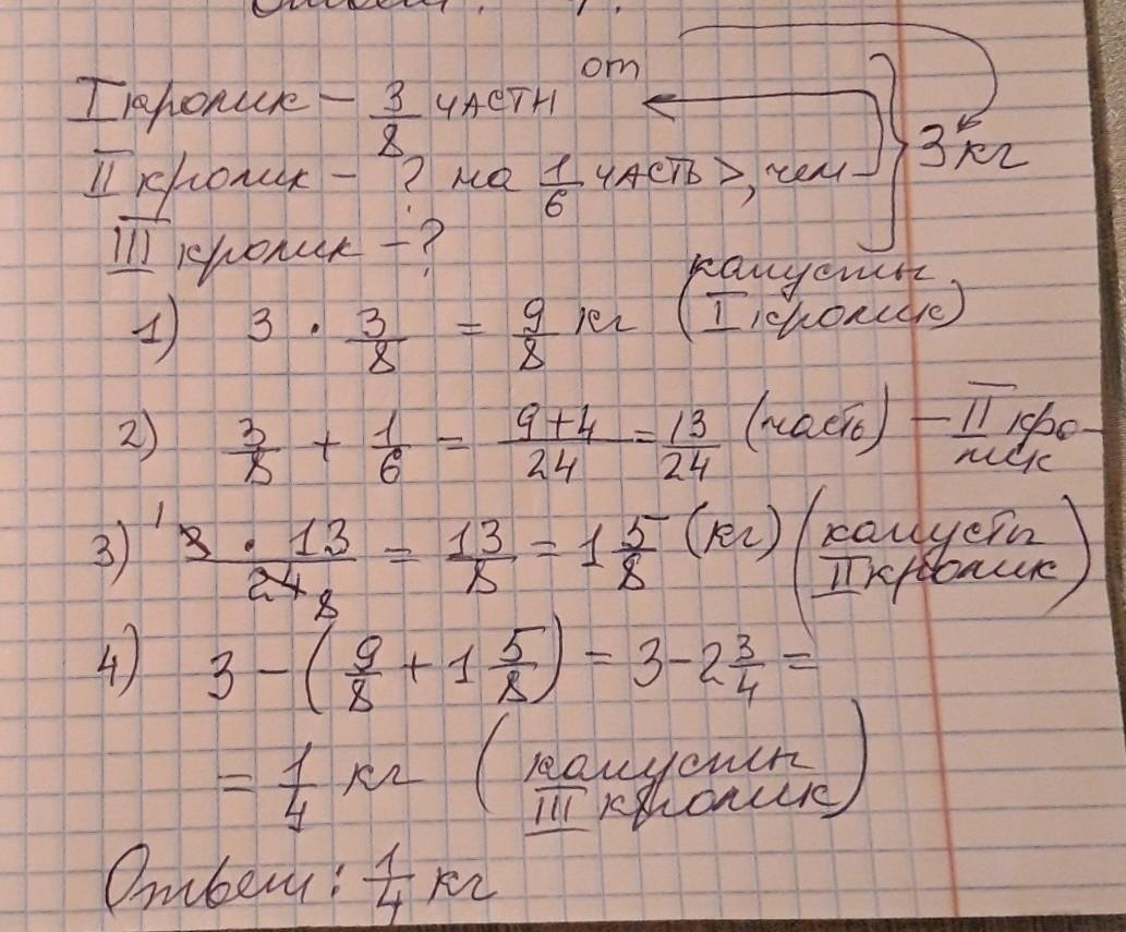 Три кролика съели вместе 3 кг капусты. Первый кролик съел 3/8 части