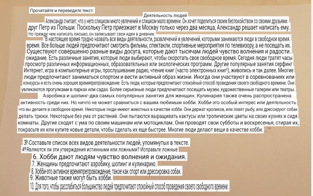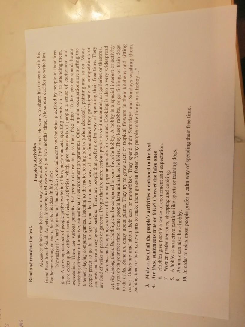 - Ответ:Первый текст деятельность Александр считает, что у него слишком много хобби и слишком мало времени. Он хочет поделиться своей заботой со своим другом Питером из Польши. Поскольку Питер приезжает в Москву только через два месяца, Александр решает написать ему, Бат, прежде чем написать электронное письмо, он записывает свои идеи в своем дневнике: «В настоящее время трудно назвать все виды деятельности, развлечения и хобби, которыми занимаются люди в их свободное время. Многие люди предпочитают смотреть фильмы, спектакли, спортивные мероприятия по телевидению, а не посещать их. Существуют различные виды досуга, которые вызывают у тысяч людей чувство волнения и ожидания людей. Есть разные занятия, которые люди предпочитают проводить в свободное время. Сегодня люди часами смотрят разные информационные, образовательные или экологические программы. Другие популярные мероприятия - серфинг в интернете, игра на конкурсах и отличное времяпрепровождение. Есть люди, которые предпочитают спокойный способ провести свободное время. Они любят прогулки в парках или садах. Более серьезные люди предпочитают посещать музеи, художественные галереи или театры. Аэробика и шоппинг - два самых популярных занятия для женщин. Кулинария также является очень распространенным видом деятельности среди них. Но ничто не может сравниться с вашим любимым хобби. Хобби - это особый интерес или занятие, которое вы делаете в свободное время. У некоторых людей есть животные в качестве хобби. Они держат кроликов, или ловят рыбу, или обучают собак делать трюки. Некоторые без ума от растений. Они пытаются выращивать eacti или тропические цветы на своих кухнях и в гостинных. Другие без ума от своих автомобилей или мотоциклов. Они проводят свои субботние и воскресные дни, стирая их, рисуя их или покупая новые детали, чтобы заставить их работать еще быстрее. Многие люди занимаются компьютерными играми для хобби, слушают радио, читают книги (часто электронные книги), Рисуют и так далее. Многие занимаются спортом и ведут активный образ жизни. Иногда они участвуют в соревнованиях