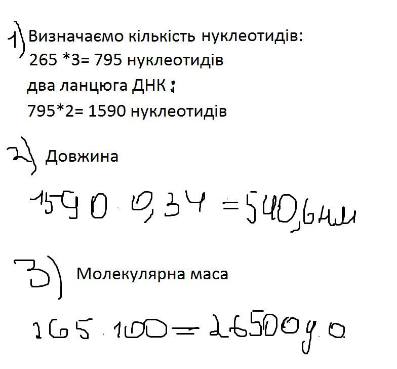 Скільки нуклеотидів містить ген, якщо в ньому закодована інформація про 265 амінокислот. Яка молекулярна маса даного гена і його довжина?