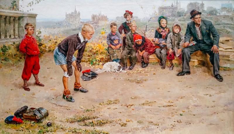 Ворота сзади вратаря сооружены из портфелей. Позади вратаря рядом с воротами стоит судья в красно-ярком костюме. Справа от вратаря сидят на скамейке зрители которые очень пристально и внимательно наблюдают за происходящим. Из зрителей тут есть и девочки и мальчики. Даже дядя когда проходил решил посмотреть на футбол. Казалось безразлична к футболу только маленькая белая собачка. Мне понравилась эта картина. В этой картине художник изобразил одно действие на всем рисунке. Футбол будет и останется самой лучшей игрой в мире.
