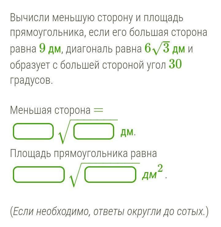 Вычисли меньшую сторону и площадь прямоугольника, если его большая сторона равна 9 дм, диагональ равна 63√ дм и образует с большей стороной угол 30 градусов.