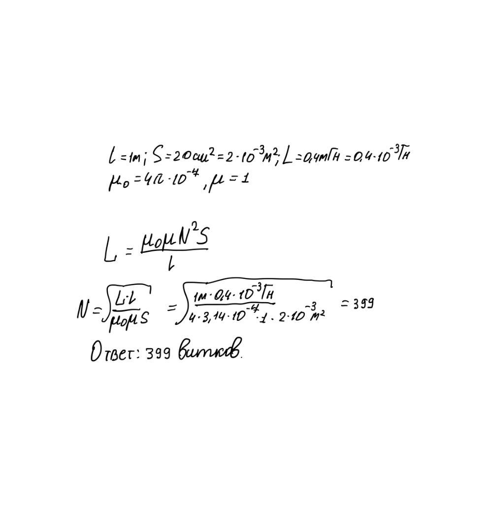 Найти число витков соленоида, если его индуктивность при длине 1 м и площади поперечного сечения 20 см2 равна 0,4 мГн