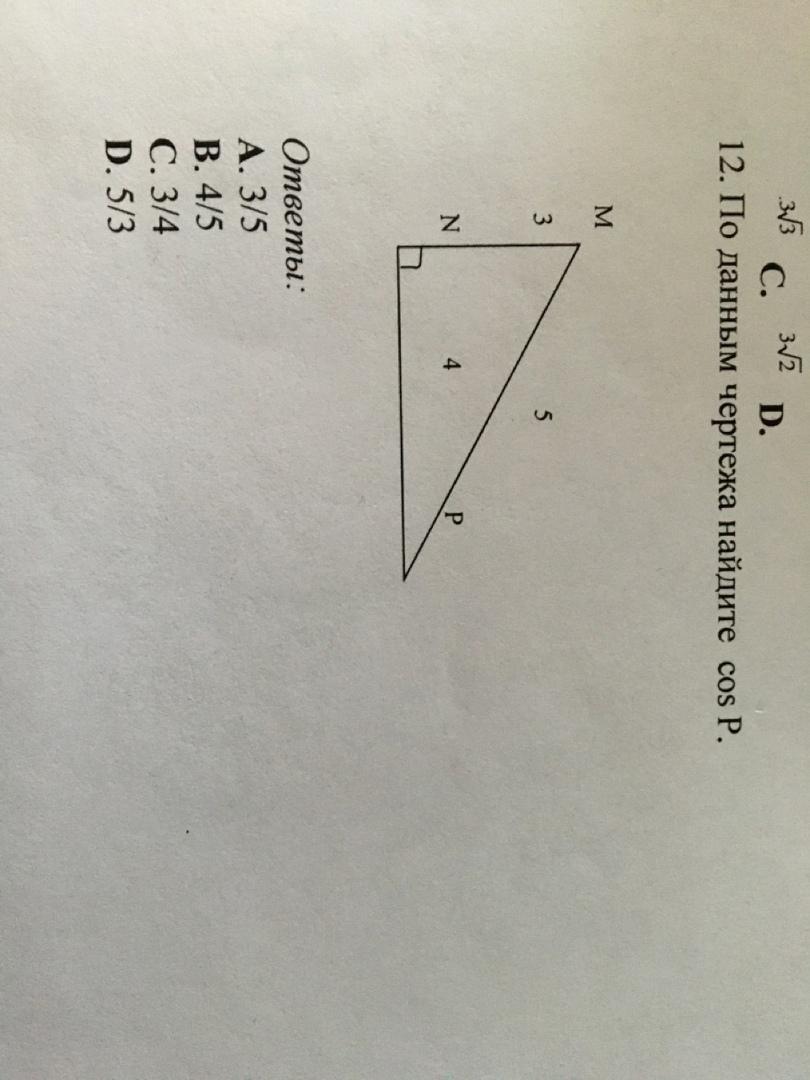 Косинус это отношение приоежащего катера к гипотезе, следовательно cosP=NP/MP=4/5