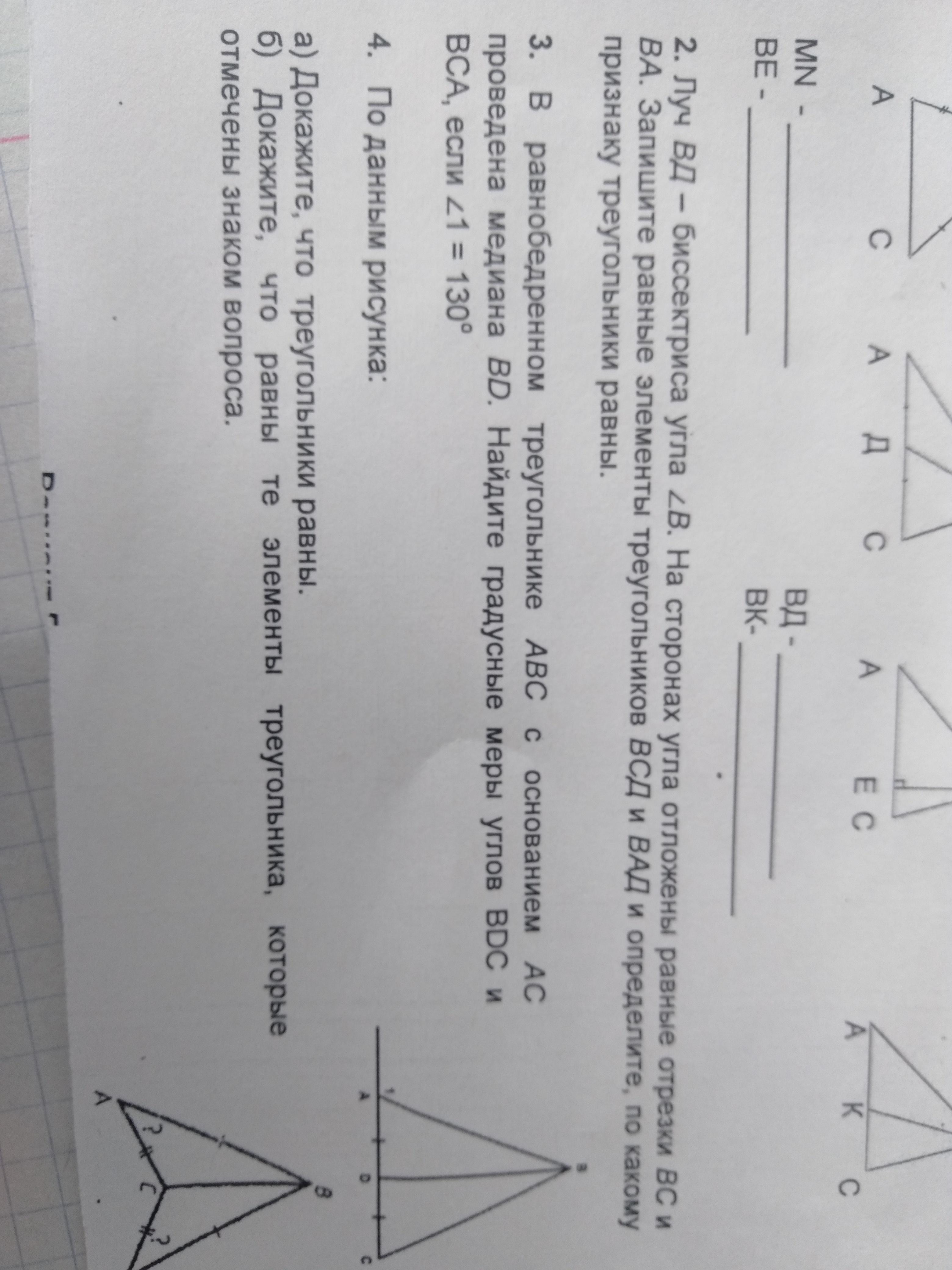 Так как ВД биссектриса, угол ДВА равен углу ДВС. Треугольники имеют общую сторону ВД и равные стороны ВА и ВС. Значит они равны по равенству двух сторон и угла между ними