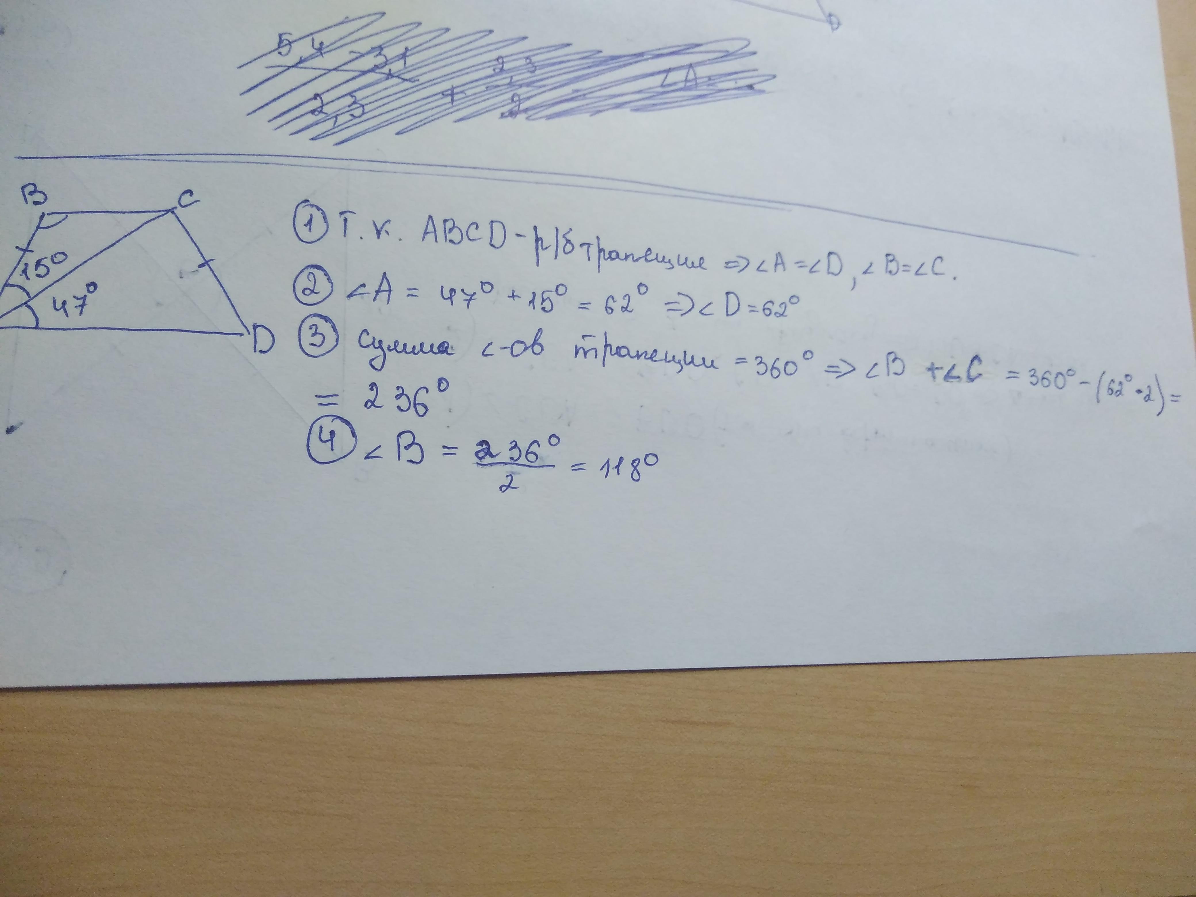 Найдите большой угол равнобедренной трапеции abcd, если диагональ ac образует с основанием ad и боковой стороной ab углы, равны 47°и 15° соответственна. Дайте ответ в градусах