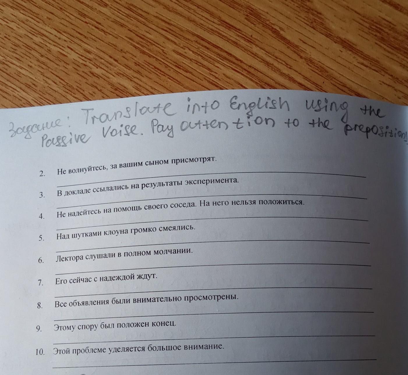 Do not worry, your son will be looked after. 2. The zoklala referred to the results of the experiment. 3. You can’t wait. Do not rely on the help of his sucked. At him 4. 5. Naz clown jokes laugh out loud. Lecturers choked in silence 6. 7. Ero is now waiting with hope. All announcements have been carefully reviewed. 8. This dispute was put to an end. 9. 10. This problem is given great attention.