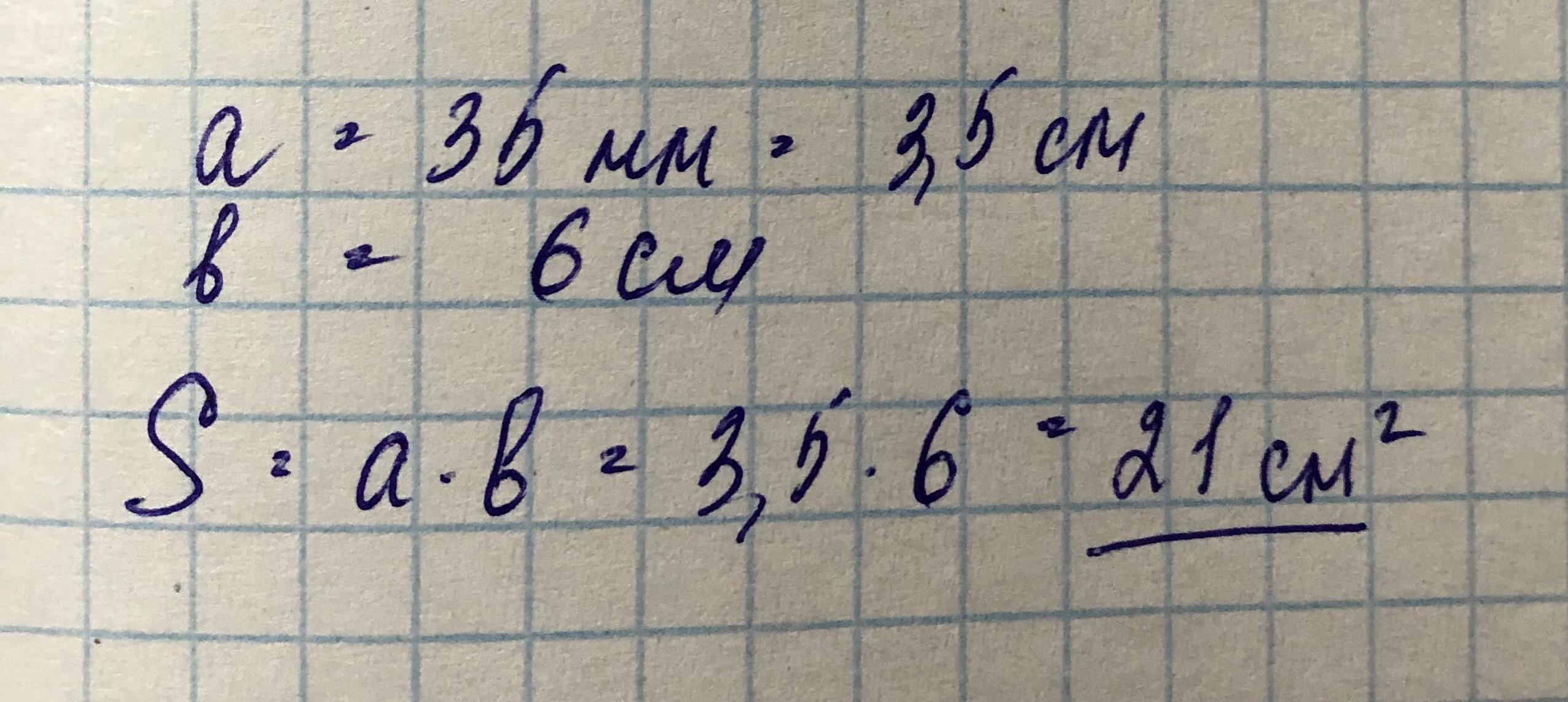 Ответ: 35 мм=3,5 см. Площадь равна 6*3,5=18+3=21 см^2.