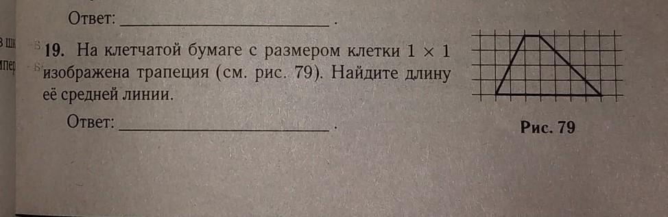 на клеточной бумаге с размером клетки 1x1 изображена трапеция.Найдите длину её средней линии