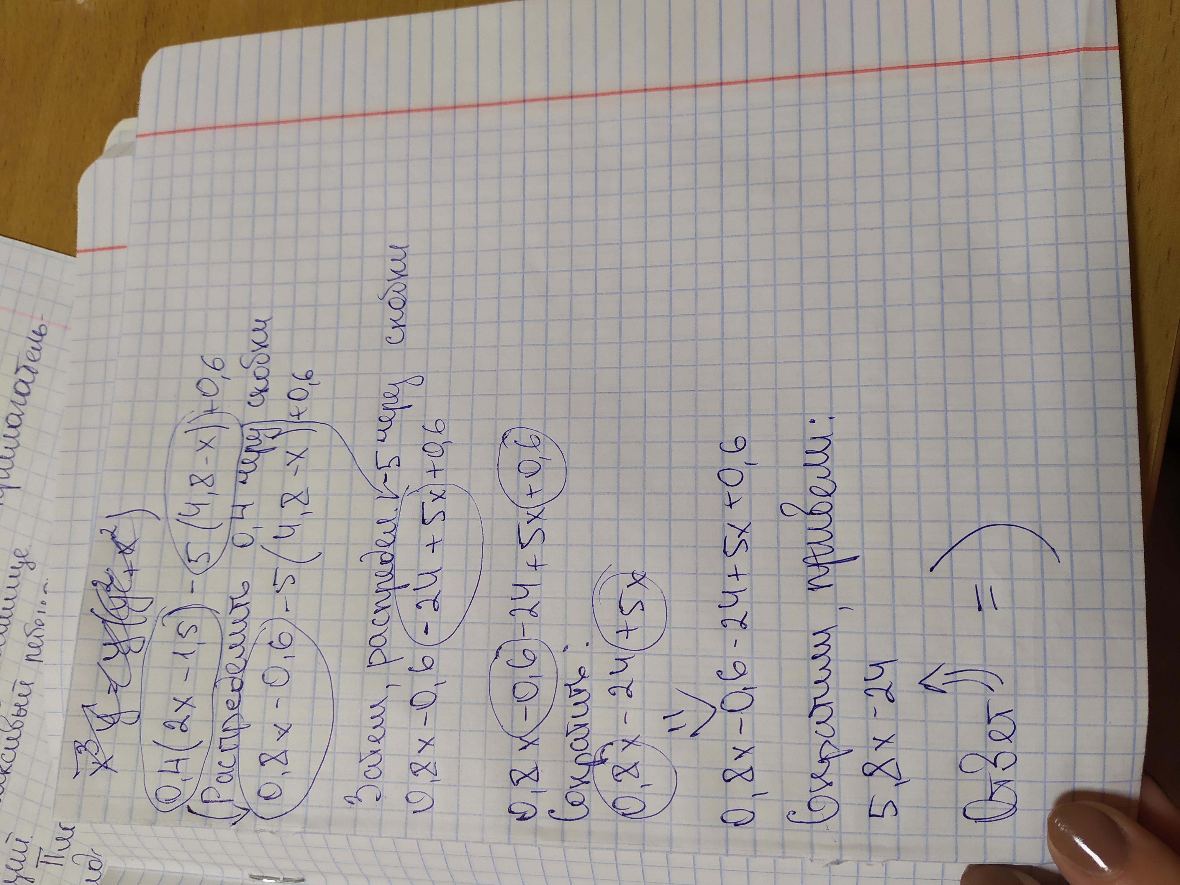 0,4(2x - 1,5) - 5(4,8 - x) + 0,6 = 0,8x - 0,6 - 24 + 5x = 5,8x - 24,6